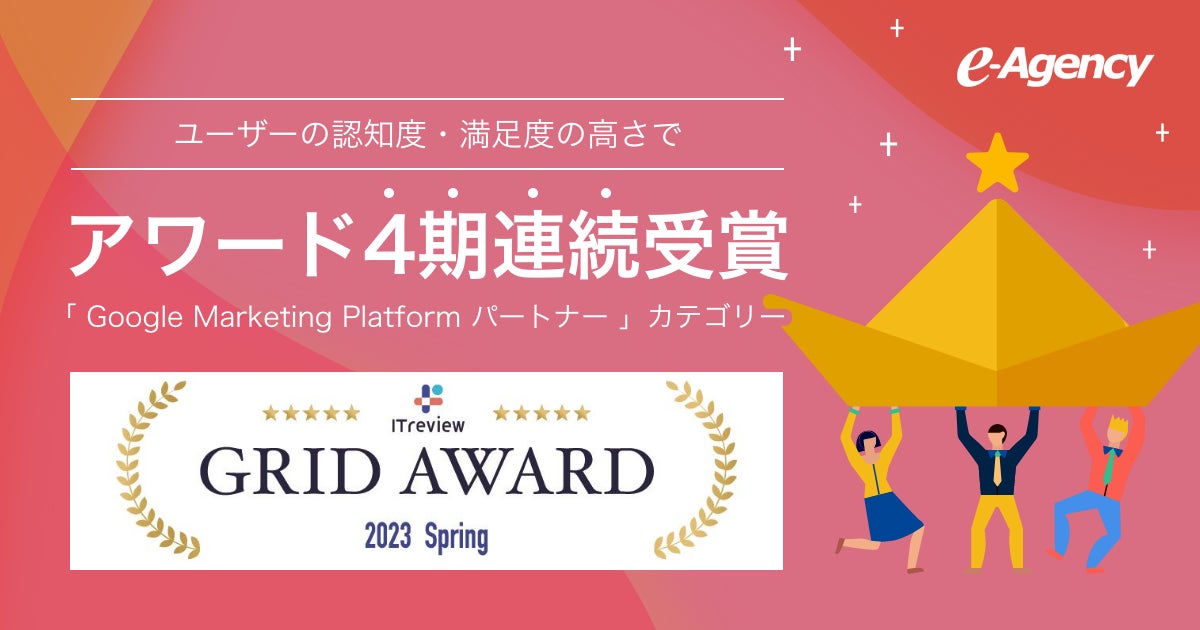 “おもてなしを科学する”株式会社イー・エージェンシー(東京都千代田区、代表取締役:甲斐真樹、以下イー・エージェンシー)は、2023年4月19日、アイティクラウド株式会社(東京都港区:代表取締役社長 黒野源太)運営のIT製品レビュープラットフォーム「ITreview(アイティレビュー)」の「Google Marketing Platformパートナー」カテゴリーにおいて、満足度・認知度ともに優れていると評価され、「ITreview Grid Award 2023 Spring」の「Leader」を受賞しました。
