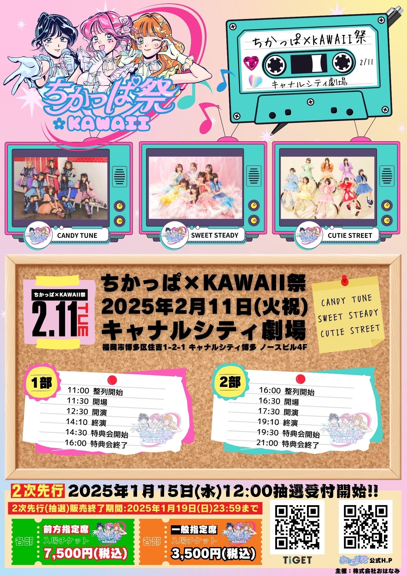 「ちかっぱ×KAWAII祭」が2025年02月11日(火・祝)にキャナルシティ劇場(福岡県福岡市博多区住吉1-2-1キャナルシティ博多ノースビル4F)にて開催されます。チケットはイベントプラットフォーム「TIGET」にて本日12:00より応募受付開始です。