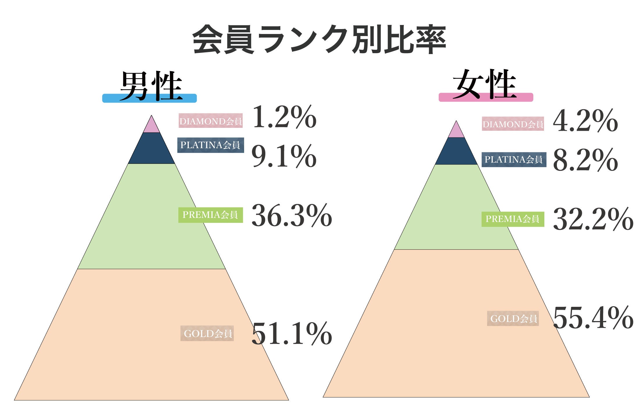 2023年10月のTHE SINGLEの平均レビュー点数は男性は3.41 、女性は3.69となりました。2023年10月のTHE SINGLEの会員ランク別比率は、男性は、DIAMOND会員が1.2%、PLATINA会員が9.1%、PREMIA会員が36.3%、GOLD会員が51.1%となりました。また、女性は、DIAMOND会員が4.2%、PLATINA会員が8.2%、PREMIA会員が32.2%、GOLD会員が55.4%となりました。