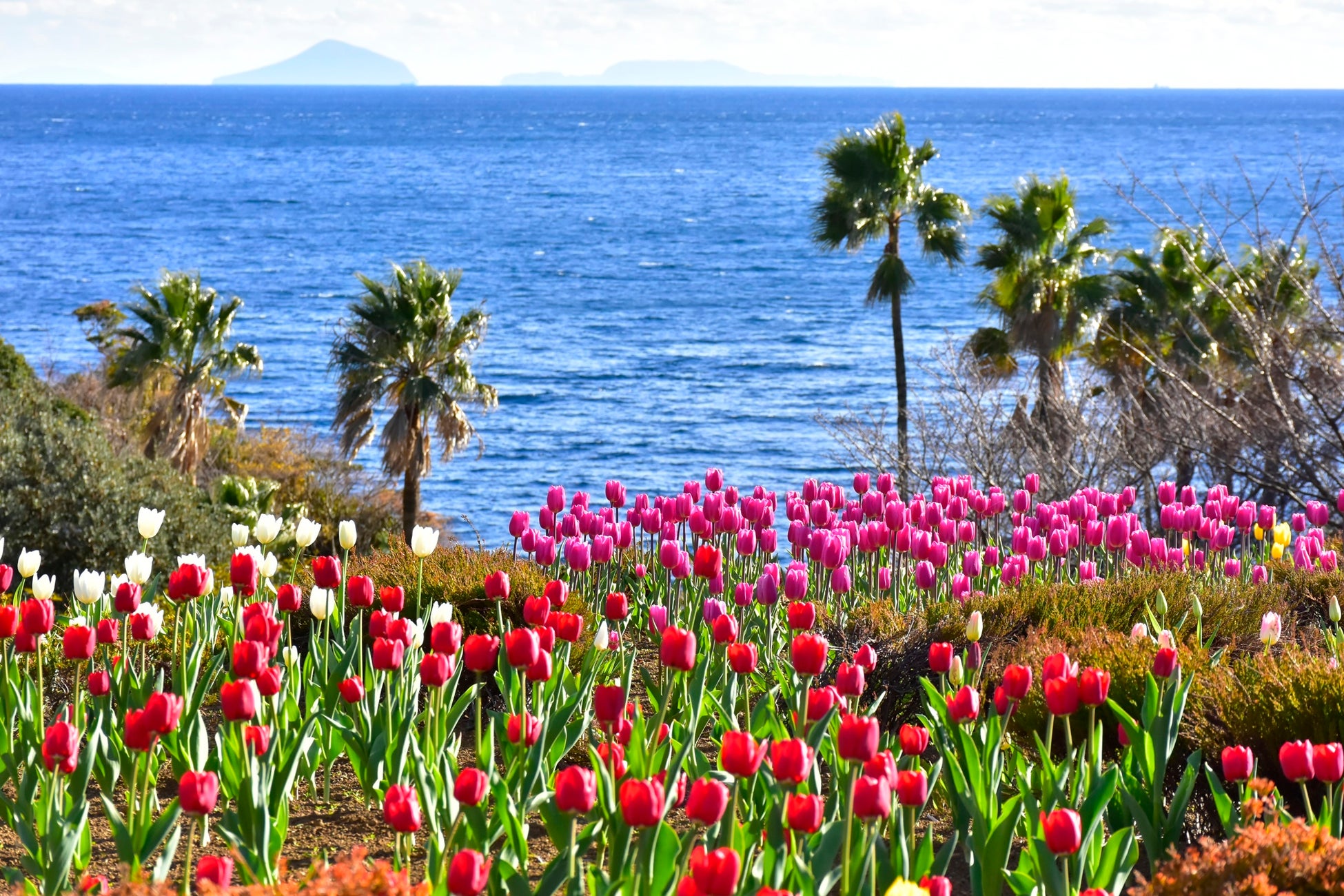 冬の寒さはこれからが本番。しかし、温暖な伊豆半島の城ケ崎海岸に位置するフラワーガーデンでは、カラフルなチューリップが咲き誇り、青い空と海にマッチして、どこよりも早く春の雰囲気を楽しむことができます。
