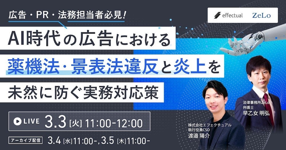 【ウェビナー3/3開催】AI時代の広告における薬機法・景表法違反と炎上を未然に防ぐ実務対応策