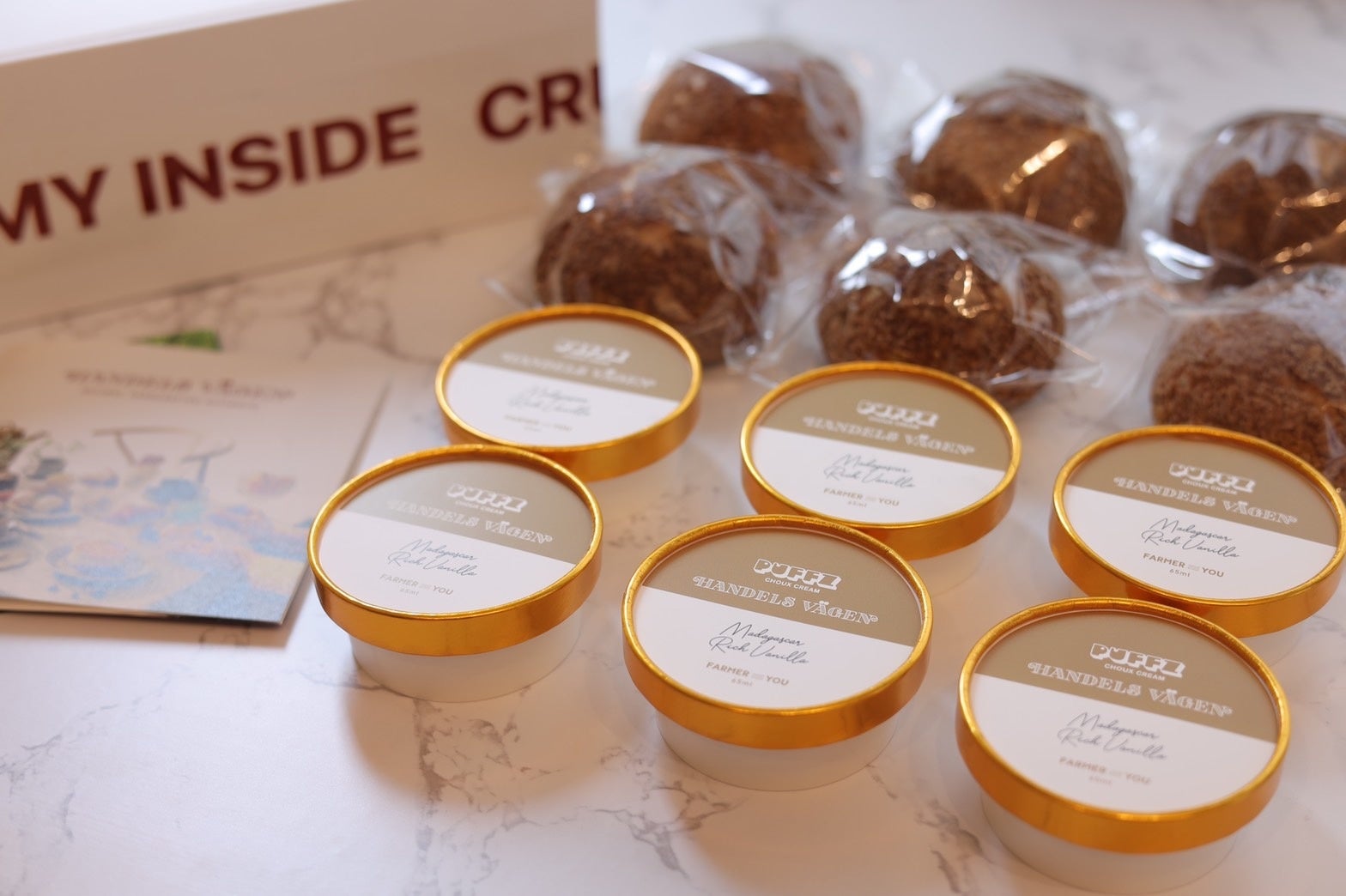 ザクザクとした心地よい食感のPUFFZのシュー生地と、アグロフォレストリバニラを用い、無添加製法で作るHANDELS VÄGENのバニラアイスクリームが6個ずつ入ったキット。