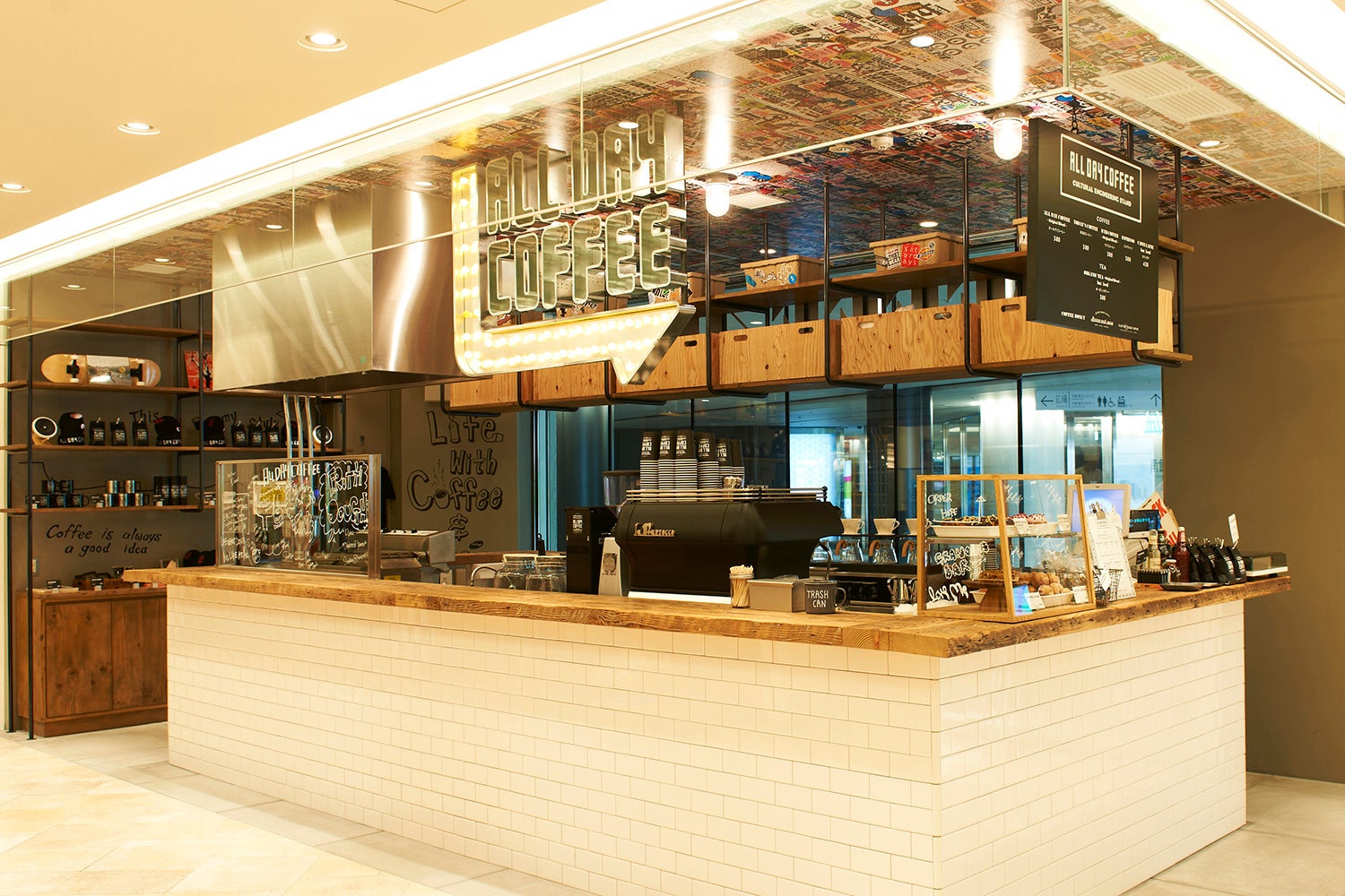 グランフロント大阪うめきた広場に位置する CULTURAL ENGINEERING STAND「ALLDAY COFFEE」は、豆の個性を最大限に引き出す淹れ方を追求したハンドドリップコーヒーや深煎りのエスプレッソを主とするカフェラテなどが楽しめる、サードウェーブコーヒーの流れを特徴的に表すコーヒースタンドです。