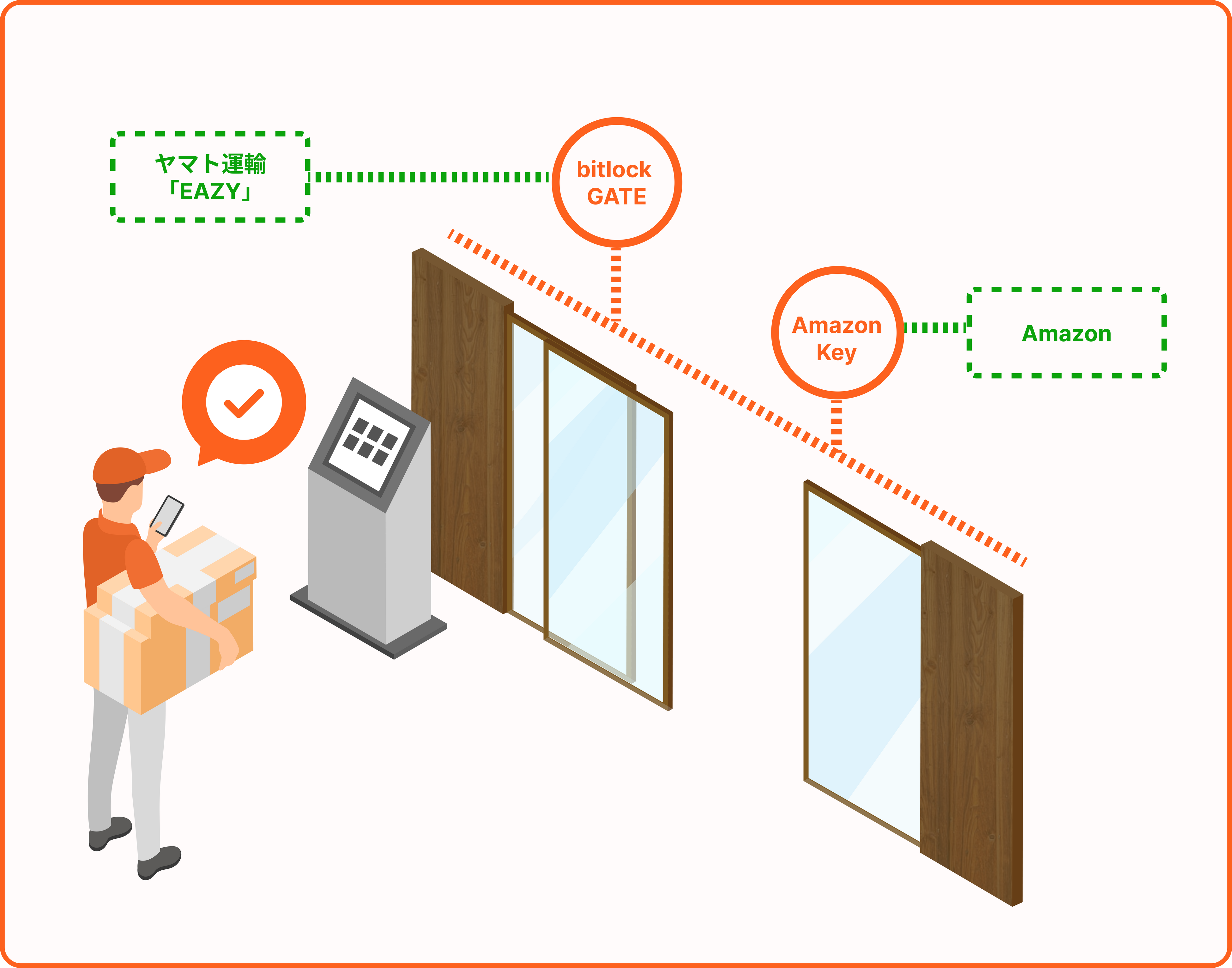 ビットキーのスマートロックを活用したサービスです。居住者の許可を得て一時的なデジタルキーを発行することで、提携する事業者のスタッフがマンションの鍵を開け、置き配などの「ドアマエ配達」や、家事代行などの「ドアナカサービス」を提供します。2025年10月時点の連携サービスは、ヤマト運輸「EAZY」の荷物(一部地域対象)、家事代行サービス、ハウスクリーニング、ペットシッターサービスなどがあります。