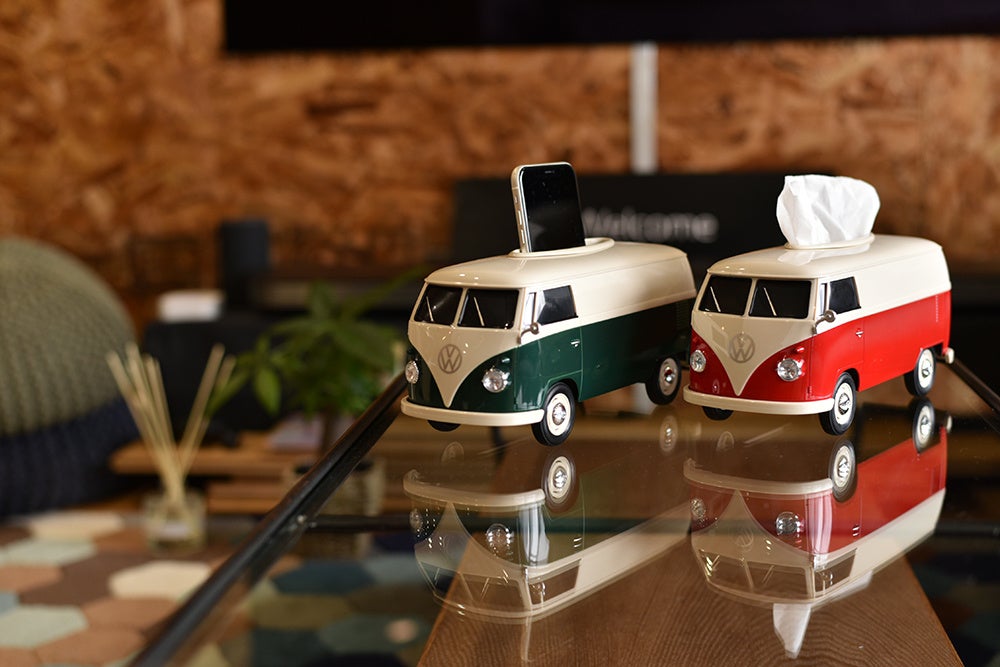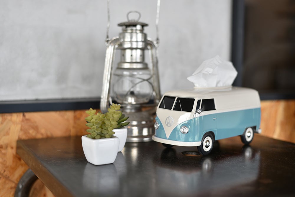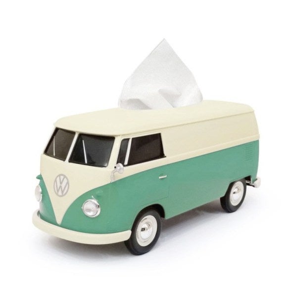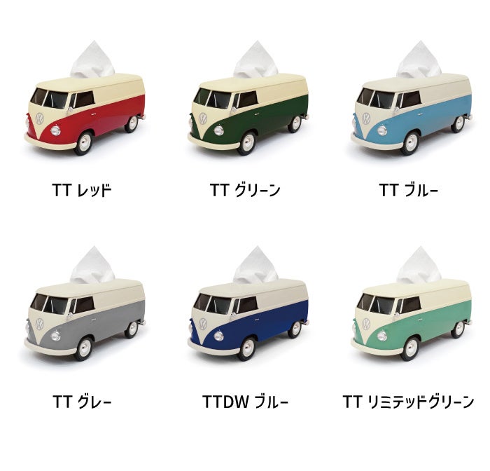 ノリモノの形の雑貨 CAMSHOPで、Volkswagenのクラシックバスの形をしたティッシュケースに新色のリミテッドグリーンが登場。
