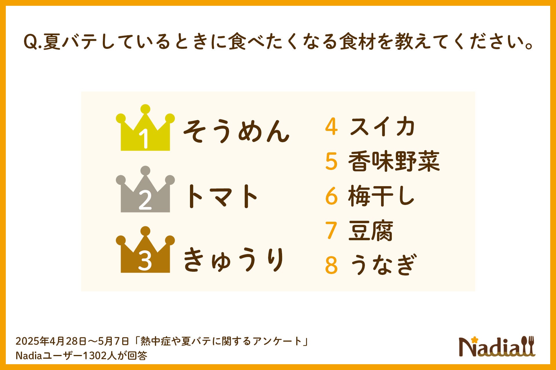 Nadia株式会社(東京都港区/代表取締役社長 葛城嘉紀)にて運営している料理メディア・Nadia(ナディア)(URL:https://oceans-nadia.com/)で「熱中症」や「夏バテ」に関するユーザーアンケート(※1)を実施しました。調査結果ならびに、管理栄養士による熱中症や夏バテ予防に効果的な食事についてや、おすすめのレシピをご紹介します。