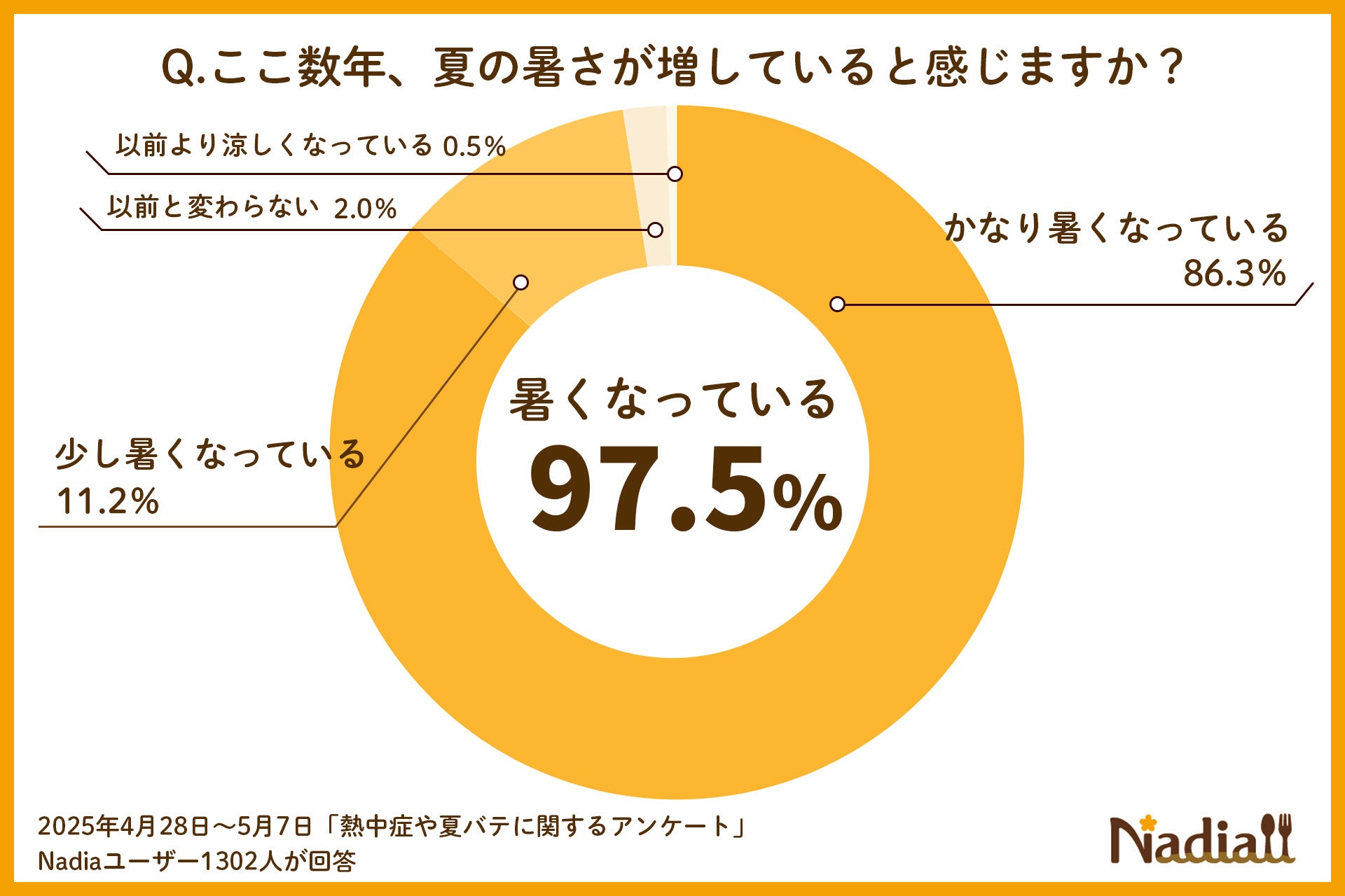 【熱中症や夏バテに関するアンケート調査結果】近年夏の暑さが増していると感じる人は97.5%