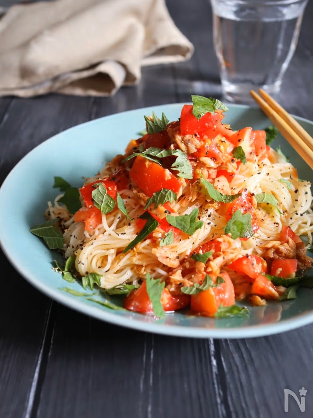 \リピート必至!/大葉香るトマトツナそうめん(にんにく風味)