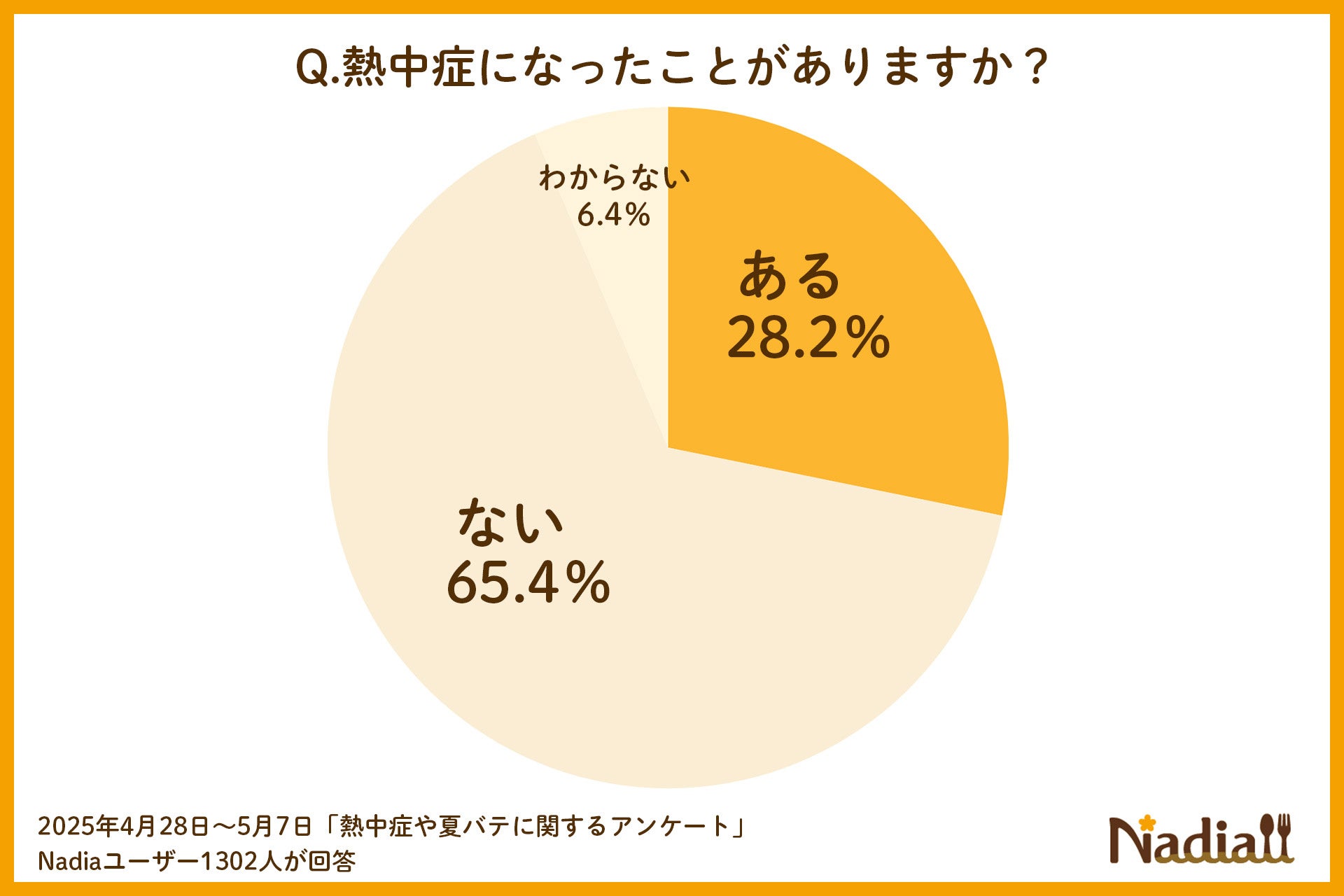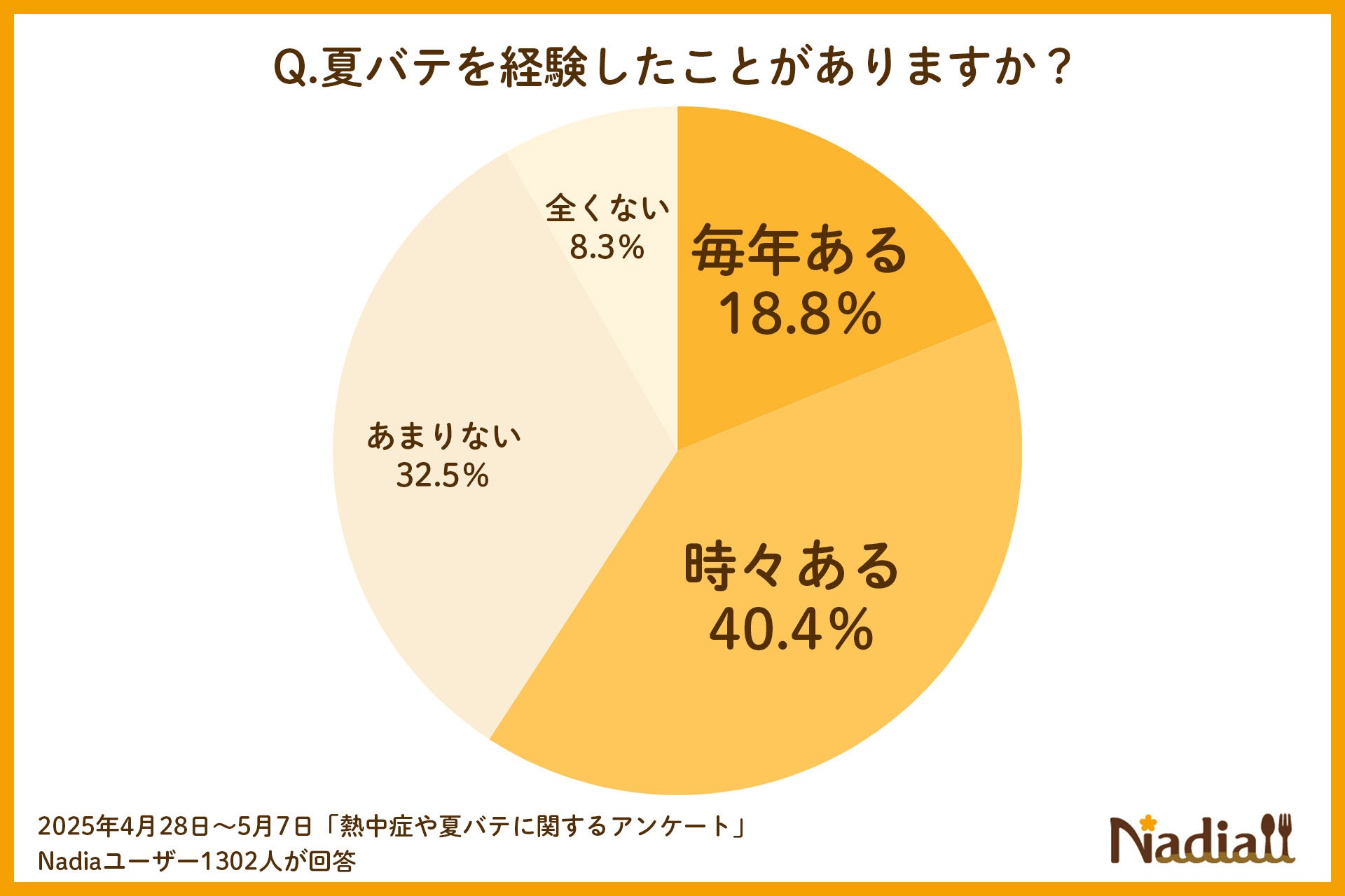 Nadiaが実施した、熱中症や夏バテに関するアンケート調査によると、昨今夏の暑さが増していると感じる人は97.5%、さらに熱中症になったことがある人は約3割、夏バテを感じることがある人も約6割にのぼることがわかりました。熱中症と夏バテは症状に共通点があるものの原因は異なり、熱中症は主に高温多湿な環境で起こる体温の上昇や脱水によって起きる急性の症状、夏バテは冷房の強い室内と暑い屋外の温度差や栄養の偏り・不足などによる自律神経の乱れによって起きる体の不調とされています。