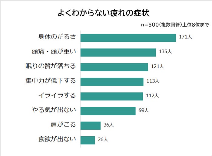 よくわからない疲れの症状1位は「身体のだるさ(171人)」。2位「頭痛・頭が重い(135人)」、3位「眠りの質が落ちる(121人)」、4位「集中力が低下する(113人)」と続きます。