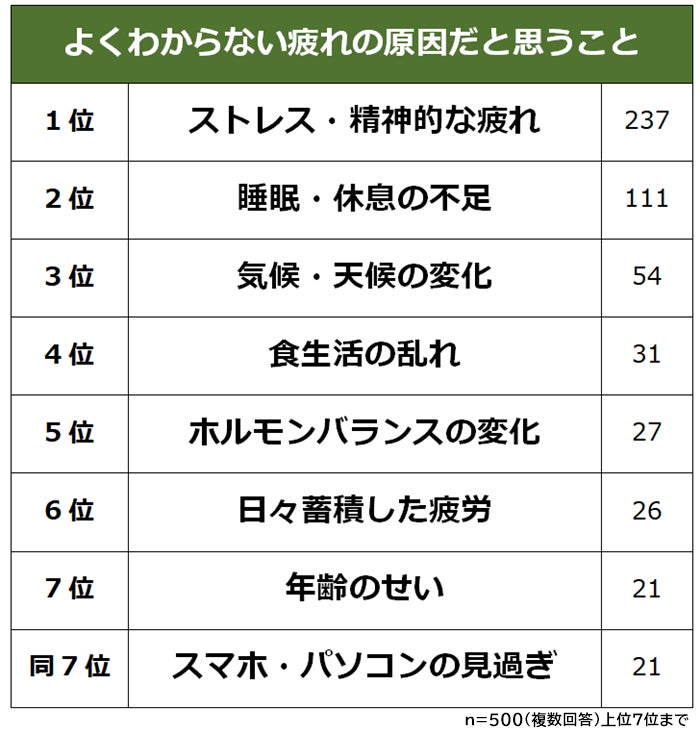 ・よくわからない疲れの原因1位は「ストレス・精神的な疲れ」