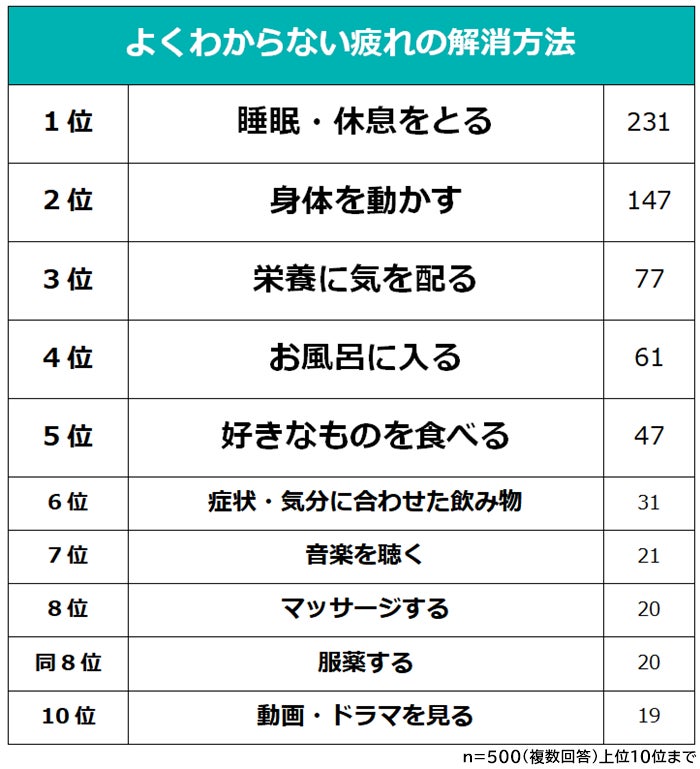 最後に、「よくわからない疲れの解消方法」を聞いたところ、圧倒的1位は「睡眠・休息をとる(231人)」。2位「身体を動かす(147人)」、3位「栄養に気を配る(77人)」と続きます。