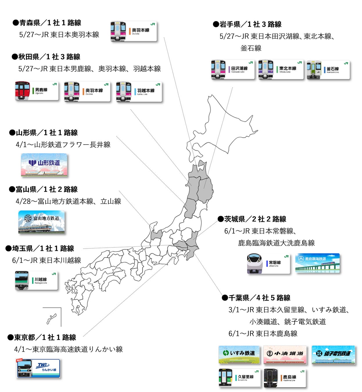 これまでに展開してきました首都圏・東北・北陸の18路線に加えて、7月1日より「ゆりかもめ」、「リニモ」、「三岐線」、「北勢線」、「外房線」の5路線にエキタグを展開します。