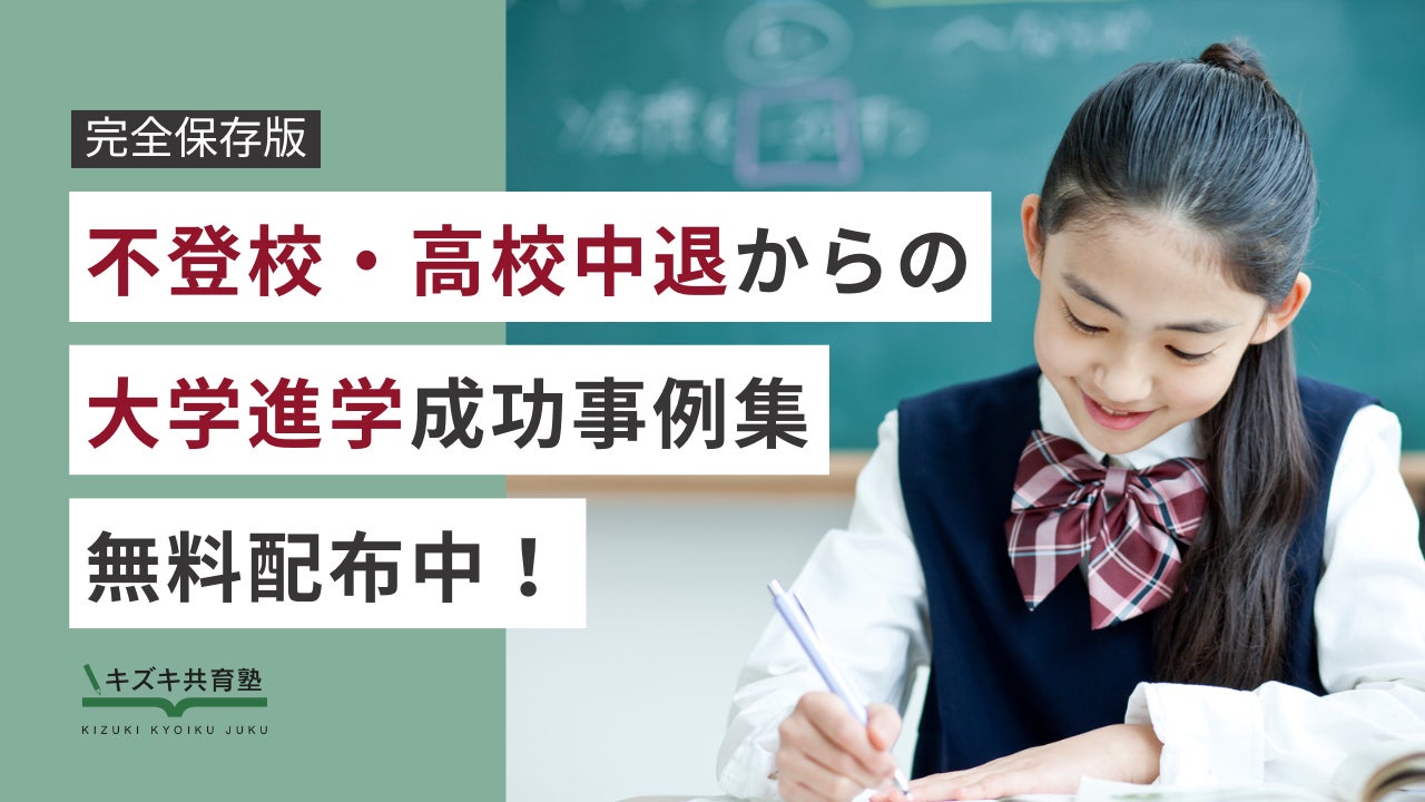 「不登校・高校中退・通信制高校生からの大学受験」に不安を抱く本人・保護者様へ。先輩たちの進路事例集を、不登校のお子さんのため完全個別指導塾・キズキ共育塾が無料で配布中!