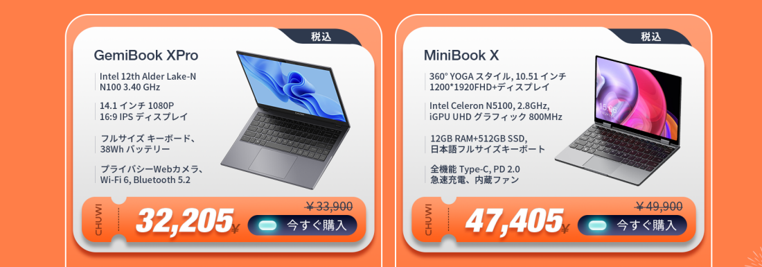 キャンペーン期間中はCHUWI JP Storeの全商品が割引対象となっており、さらに一部商品をCHUWI史上最低価格で販売いたします。この機会にぜひお買い物をお楽しみください!割引クーポンが当たらなかったお客様達も、お好みのパソコンやタブレットを最安値で手に入れることができます。