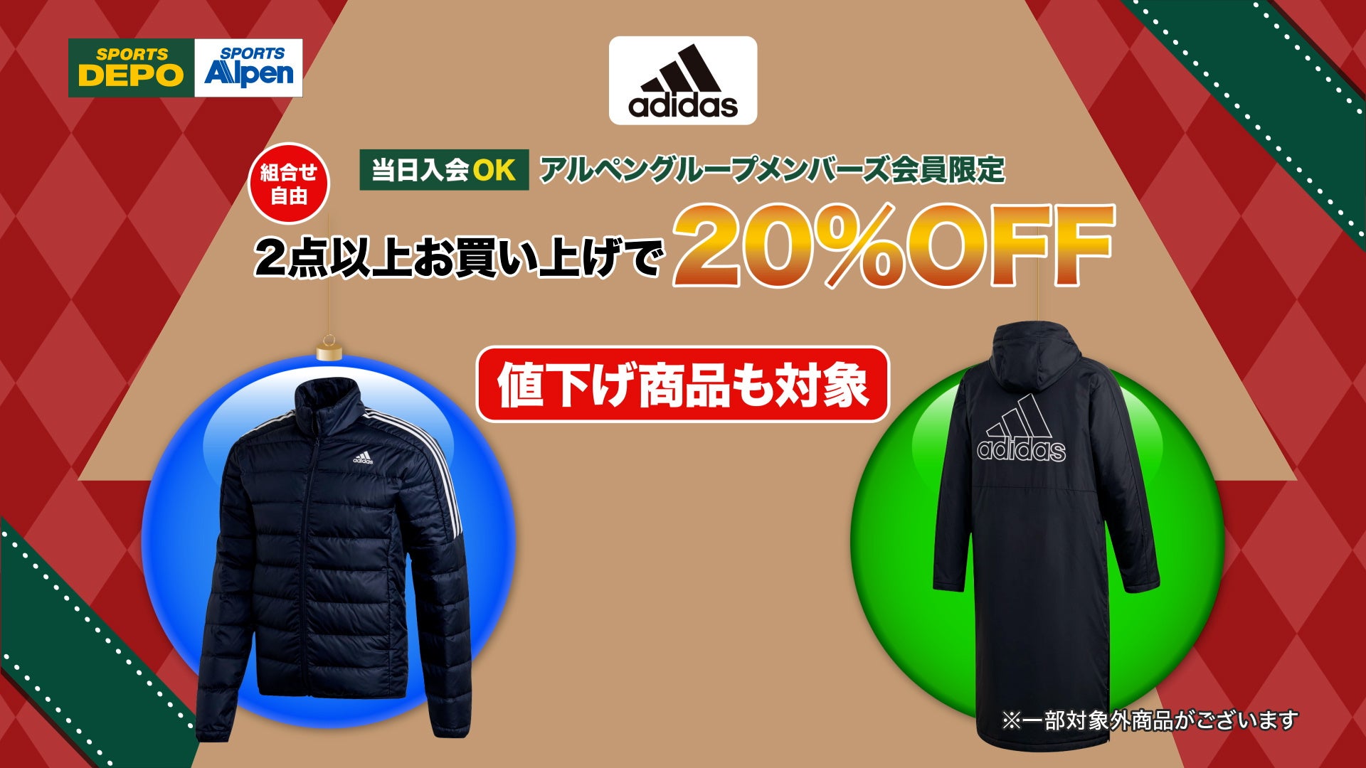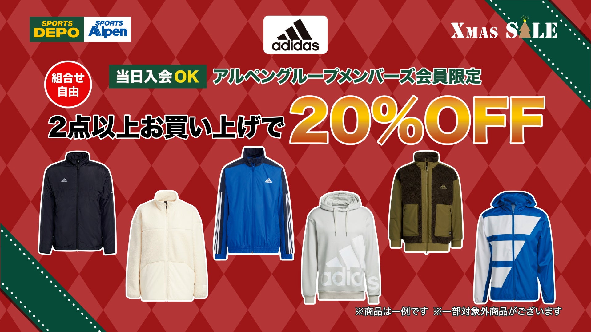 人気のアディダスウェアは大変お得な特別企画も同期間にご用意いたしました。組み合わせ自由で2点以上お買い上げでなんと20%OFFに。今すぐに欲しい防寒アウターや、プレゼントにも最適な各競技スポーツウェアなど、数多くの商品をラインナップいたしました。既に値下げになっている商品や、大人用とお子さま用、サッカー・ランニング・テニスウェアなどの組み合わせも自由なので買い逃しのないよう、ぜひこの機会にお得なお買い物をお楽しみください。