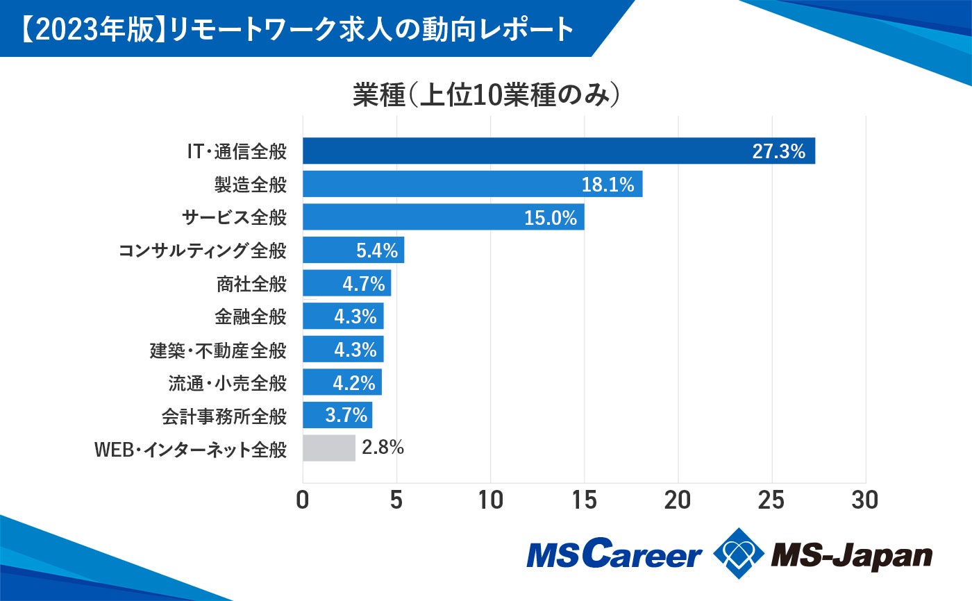 IT・通信全般では、リモートワークでも効率よく進めるためのツールの普及率が比較的高いことから、割合が多いと考えられるでしょう。