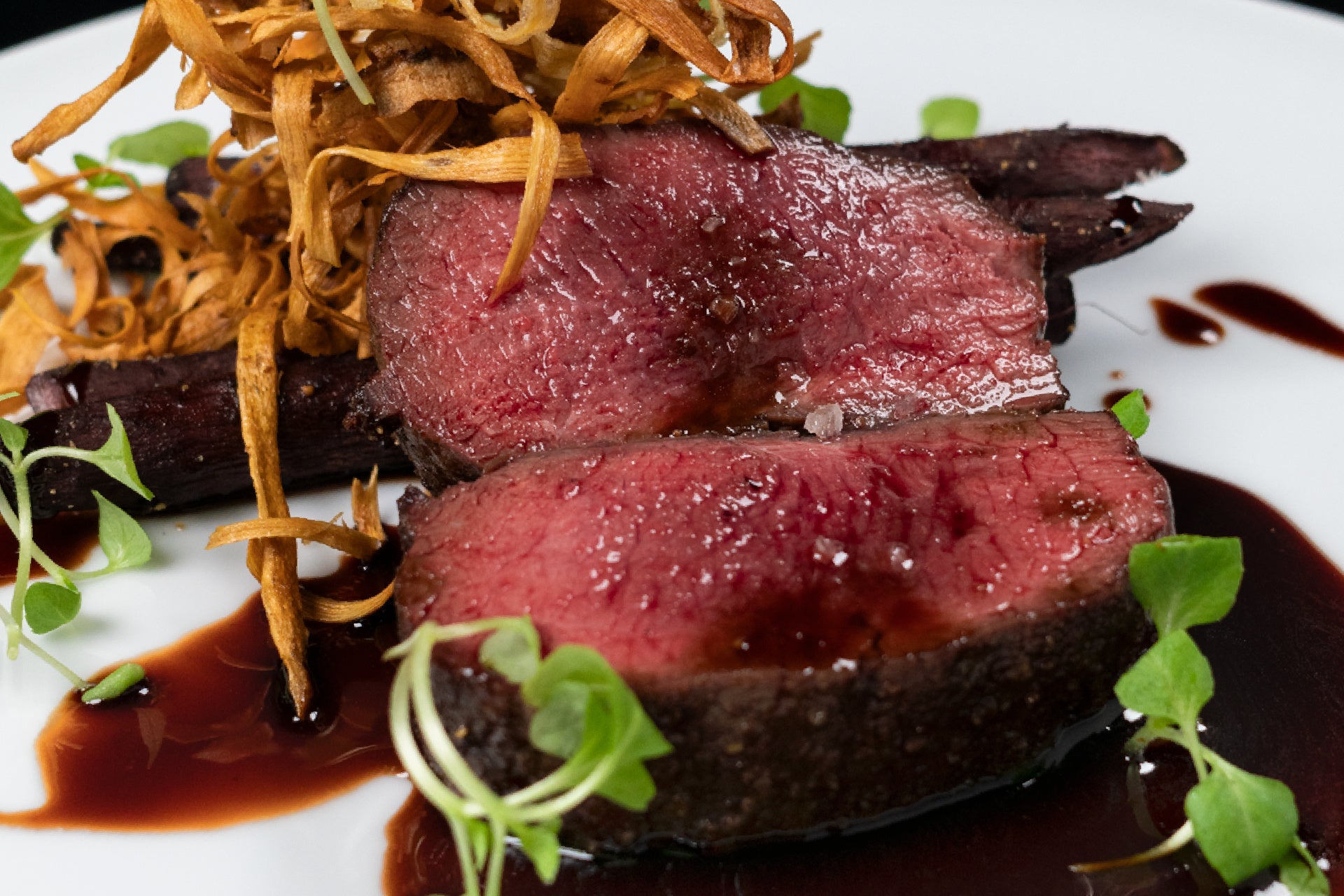 野生ならではの引き締まった肉質ながら、クセがなく澄んだ旨味が特長の鹿肉ロースをしっとりとやわらかく火入れし、赤ワインのソースで仕上げました。