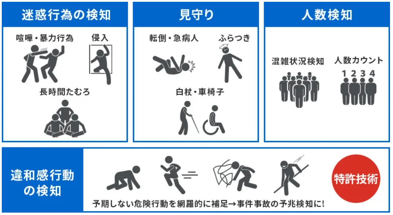 各カメラにおける行動をAIが自律学習し、通常から逸脱した動きを「違和感」として検知。予期しない危険行動を即時通知することで、事件事故の未然防止に繋げます。