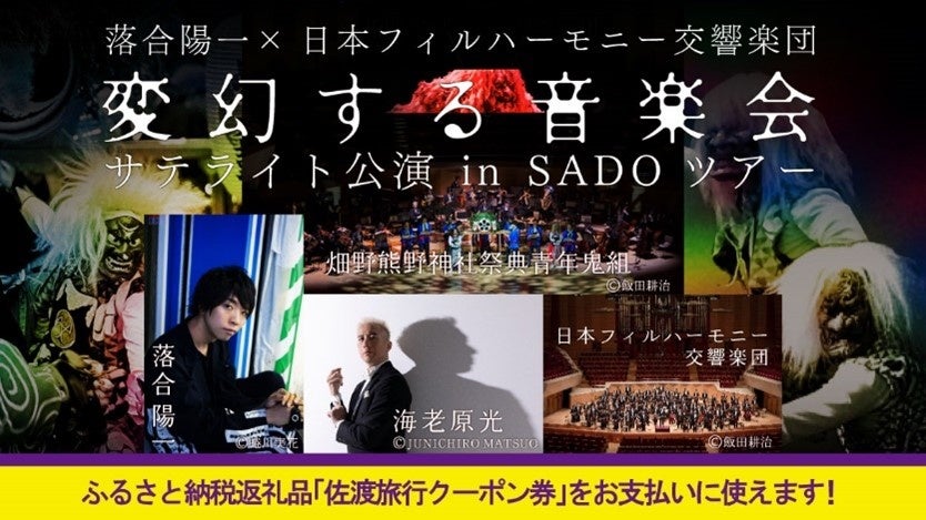 佐渡汽船株式会社は、2024年10月21日(月)に、佐渡市内のアミューズメント佐渡で行われる「落合陽一×日本フィルVOL.8《変幻する音楽会》サテライト公演 in SADO」にあわせ、往復船便きっぷとコンサートチケットのセットプラン「落合陽一×日本フィル 変幻する音楽会 サテライト公演 in SADOツアー」の販売を、2024年10月3日(木)に開始します。
