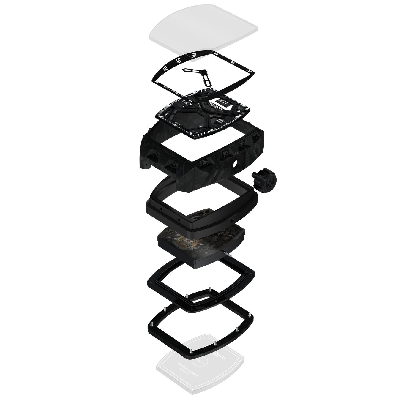 旗艦モデルの一つである「XP1 Tourbillon LT (Luminescent Tourbillon)」の 軽量かつ強度の高いカーボンケースは、鍛造工程でルミノバパウダーを組み込むことで、暗闇で光るユニークなデザインとなっています。
