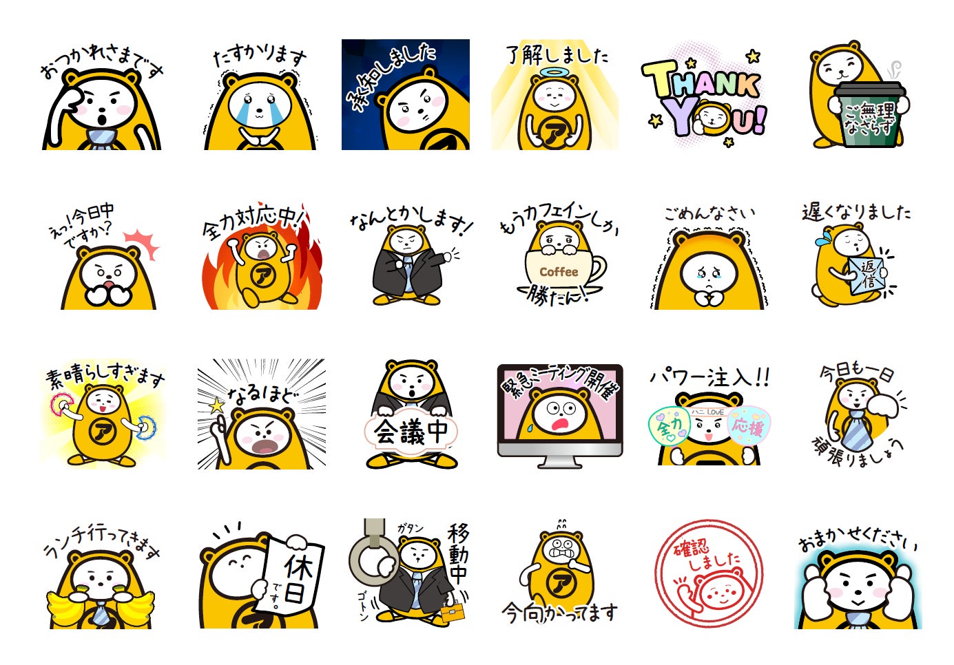 「おつかれさまです」「了解しました」「会議中」「全力対応中!」など、社内外のやり取りで活躍する実用的なスタンプをラインアップしました。思わずクスッと笑ってしまう“べあ~君らしい表情”も満載で、仕事のコミュニケーションを和ませるアイテムとしてもお使いいただけます。