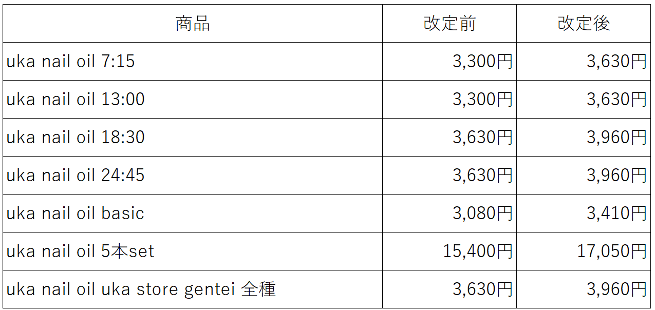 2022年8月23日(火)より uka nail oil / 一部uka直営限定商品 価格改定のご案内。