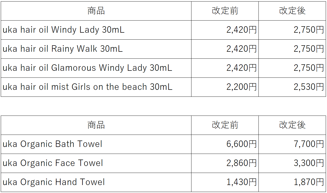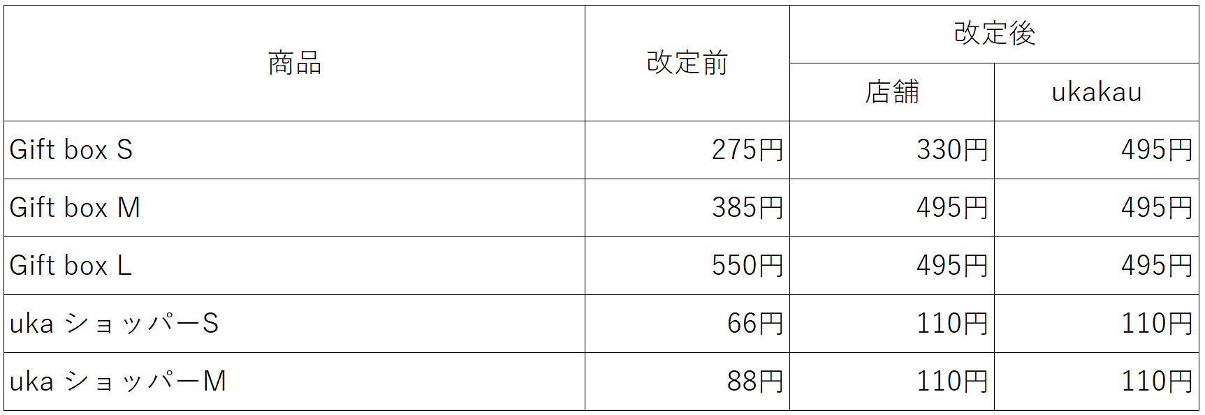 | 商品名 | 改定前 | 改定後(店舗) | 改定後(ukakau) |