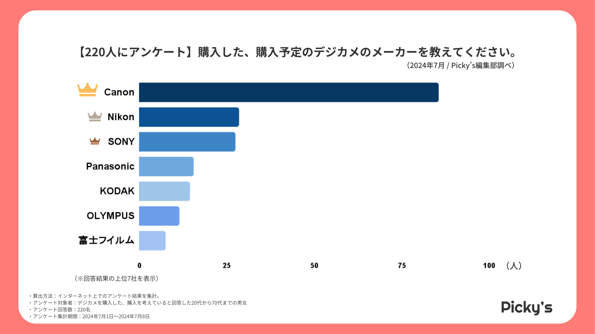 アンケート結果によると、デジカメの購入・購入予定のメーカーとして最も人気があるのは「Canon」でした。