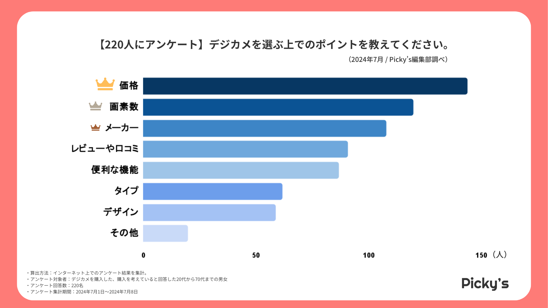 アンケート結果によると、デジカメを選ぶ際のポイントとして最も重視されるのは「価格」でした。