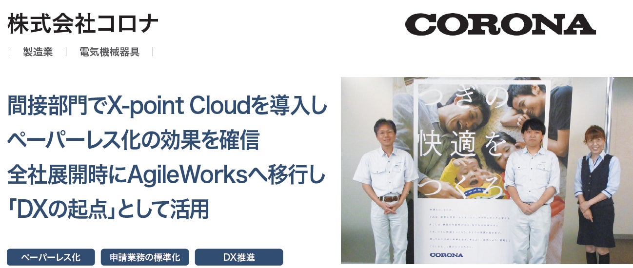 株式会社コロナが、ワークフローシステム「AgileWorks」導入により、申請業務のペーパーレス化を実現し約80,000枚/年の紙を削減