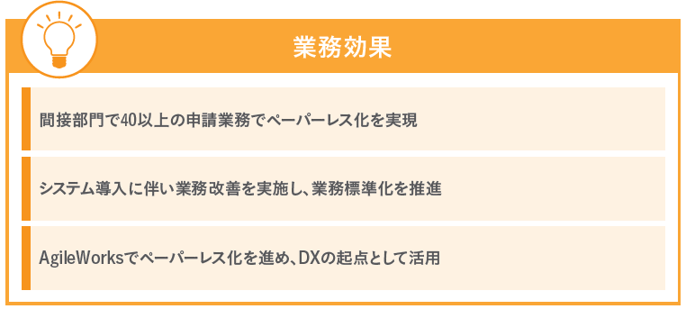 その後、社会全体のデジタル化の加速を受けて2021年に全社的な業務変革の取り組みをスタートさせたことから、大規模組織向けの新たなワークフローシステムを選定することとなり、操作性や複数の要件で6製品を評価した結果、AgileWorksを選定いただきました。操作性や直感的に理解しやすいUIに加えて、CSVによるデータ出力が可能な点も高くご評価いただきました。