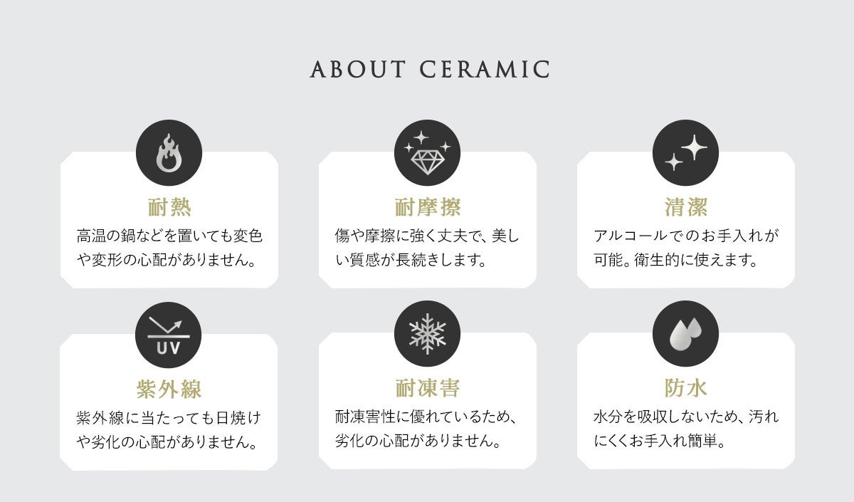 セラーノは、上質な石目調デザインを再現したセラミック天板を採用。マットな質感で指紋や汚れが目立ちにくく頑強なため、見た目だけでなく機能性の観点でも人気の素材です。