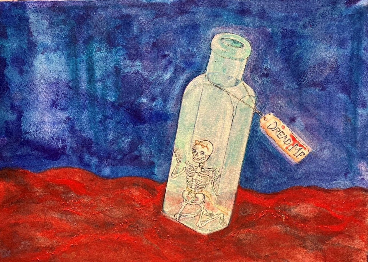 アリスは不思議の国でさまざまな冒険をしますが,特に印象に残っている『Drink Me(私を飲んでね)』と記され,飲むと小さくなる魔法の薬が入った小瓶のエピソードからインスピレーションをもらいました。そして,原作にはナンセンスな言葉遊びが含まれる事のオマージュより,瓶に封じ込められたアリスは骸骨になって『Dread Me(私を怖がってね)』と,あなたを「こわい」にお誘いするのです。