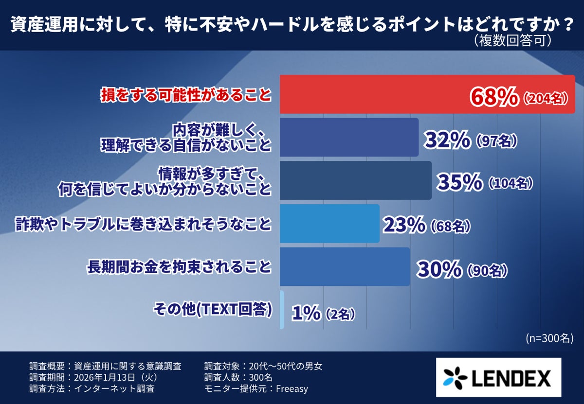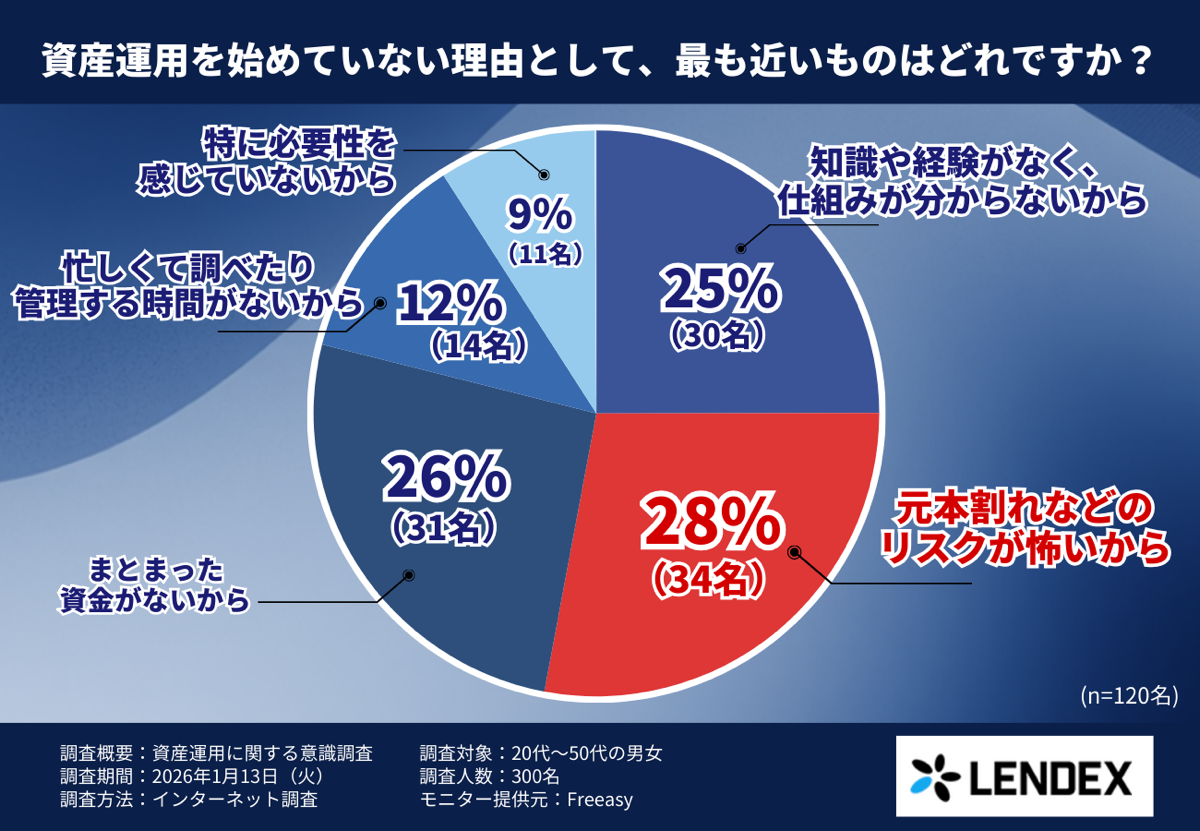 そこで株式会社LENDEX(本社:東京都渋谷区、代表取締役:中村 智)は、20〜50代の男女300名を対象に、資産運用を始めていない理由や、心理的ハードルに関する意識調査を実施しました。
