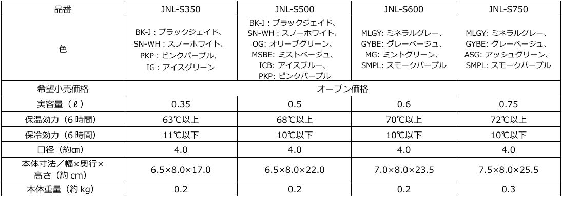 『サーモス 真空断熱ケータイマグ(JNL-S350/S500/S600/S750)』 仕様一覧