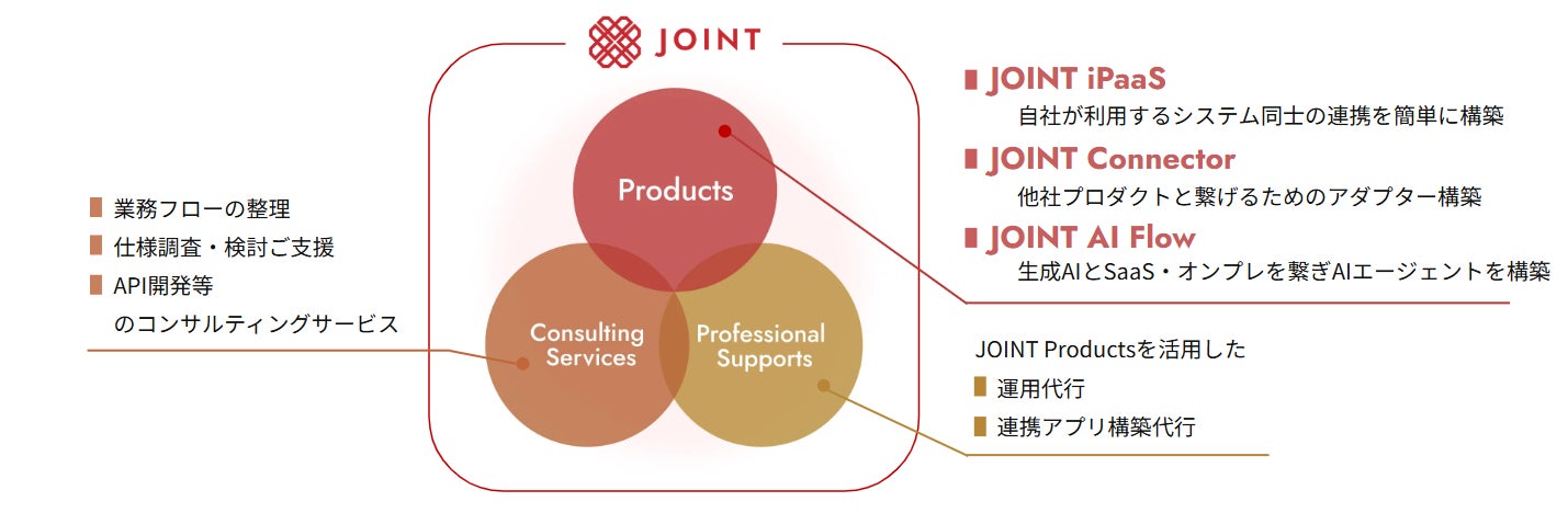 「JOINT」は、生成AIを活用した社内業務システム連携を可能にする「JOINT AI Flow」と、データ連携の構築・運用・管理をワンストップでサポートする「JOINT iPaaS」を備えています。
