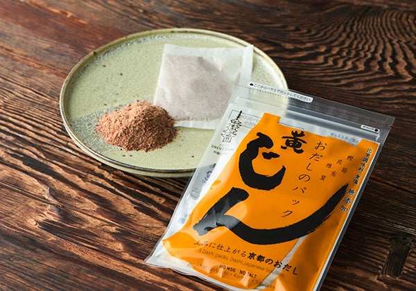 シリーズの中でも「じん(黄)」は、かつおのおだしを手軽に引いていただけるだしパック。特に京都のおだしは、あっさりとしたかつおだしが主流。うね乃の手づくりおだしパックです。