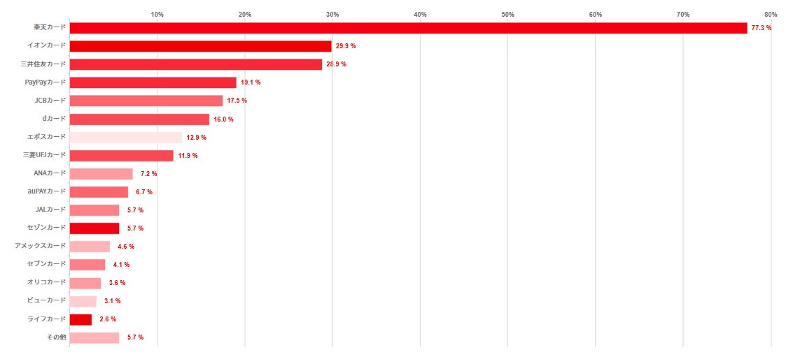 楽天カードが77.3%で最も多く、イオンカードが29.9%でこれに続いた。また、三井住友カードも28.9%とこれに迫る勢いだった。