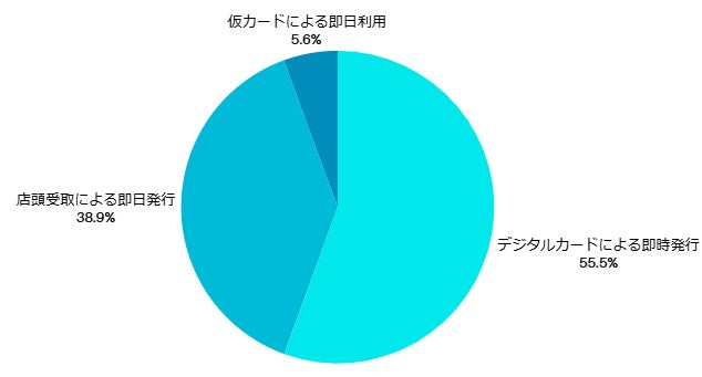 「デジタルカードによる即時発行」が55.5%で最も多かったが、「店頭受取による即日発行」も38.9%とこれに迫る勢いだった。なお、「仮カードによる即日利用」は5.6%であった。