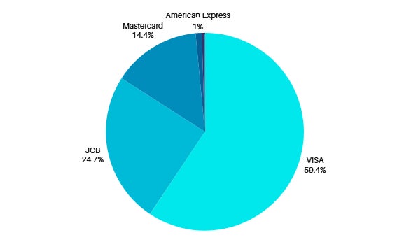 Visaが59.4%で最も多く、JCBが24.7%、Mastercardが14.4%で続いた。American Expressは全体の1%に留まった。
