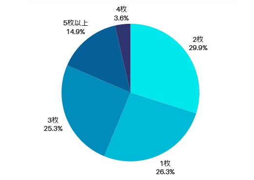 「2枚」が最も多く、「1枚」「3枚」と続いた。全体としては、複数のクレジットカードを持ち合わせている人が全体の7割にのぼることもわかった。