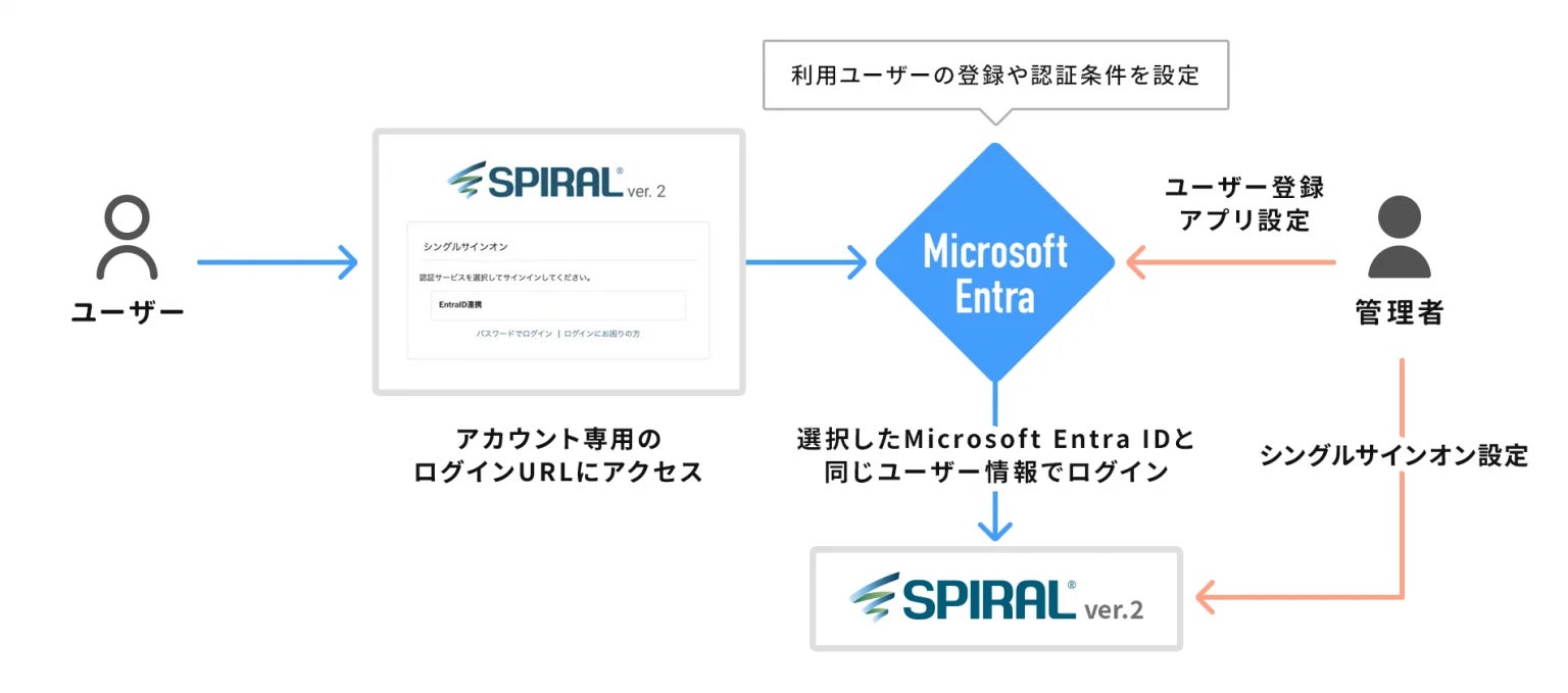 このたびのアップデートにて「Microsoft Entra ID」とのSAML認証を用いた連携によるシングルサインオンに対応し、「Microsoft Entra ID」と同一のメールアドレスで登録されている「SPIRAL ver.2」ユーザーは、管理画面へのログイン時に「Microsoft Entra ID」を利用した認証が可能となります。これにより、「Microsoft Entra ID」を利用する企業におけるセキュリティポリシーに準拠したアクセス管理の実現と運用負荷軽減に寄与いたします。