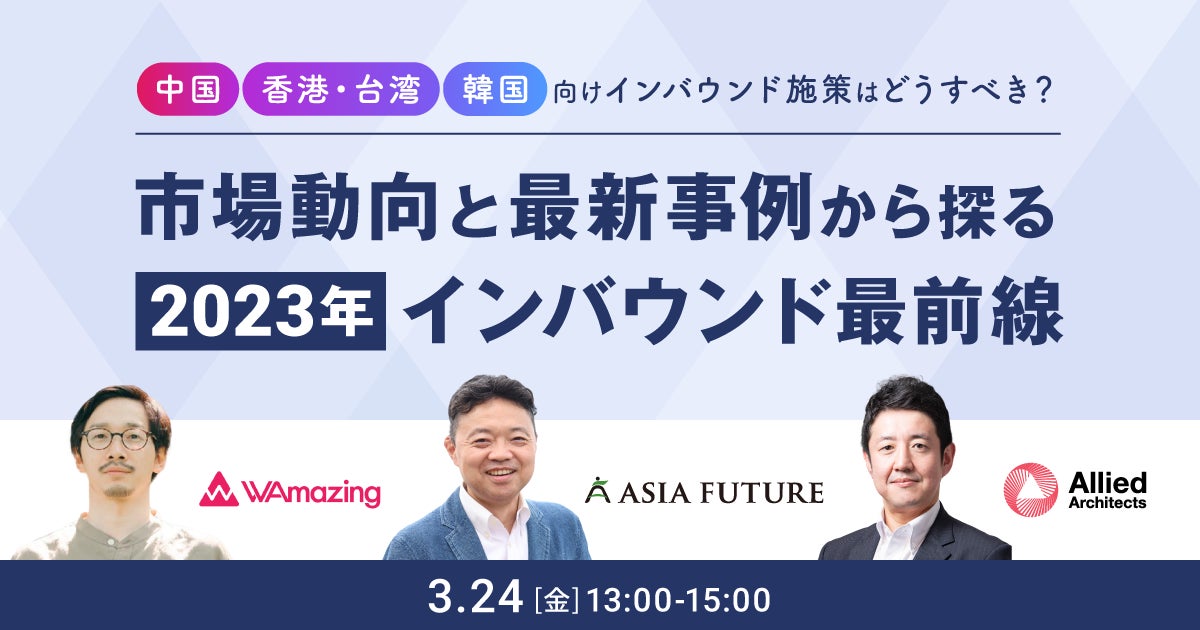企業のマーケティングDXを支援するアライドアーキテクツ株式会社(東京都渋谷区、代表取締役社長 CEO:中村壮秀、証券コード:6081)で中国進出支援事業を展開するクロスボーダーカンパニー(プレジデント:番匠達也)は、インバウンドプラットフォームサービスを提供するWAmazing株式会社(東京都台東区、代表取締役CEO:加藤史子、以下WAmazing)と、SNSと自社店舗で日本好きな韓国人と日本企業へのマッチングを行うアジアフューチャー株式会社(福岡県福岡市、代表取締役:松清一平、以下アジアフューチャー)と共同で、中国、香港・台湾、韓国向けインバウンド施策を検討中・実施中の日本企業様を対象とした「市場動向と事例から探る 2023年インバウンド最前線」無料セミナーを3月24日(金)に開催いたします。