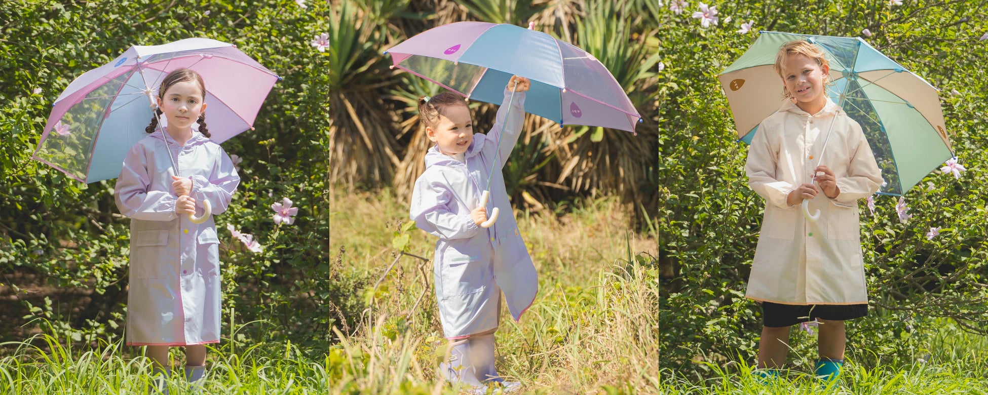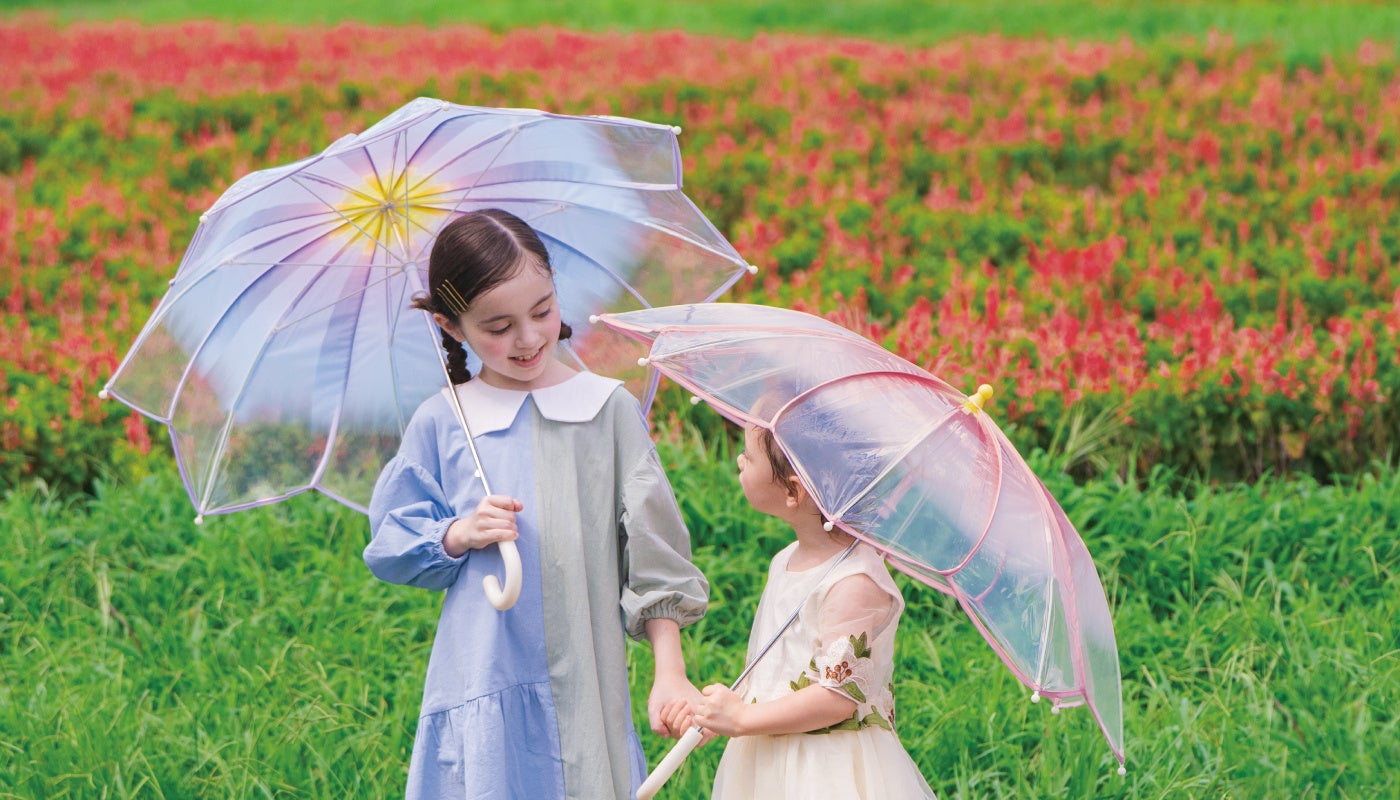 新作には花びらのような形が印象的な「フラワーフェアリーズアンブレラ」、空の色をイメージした「空色アンブレラ」、また人気のプレーン(無地)シリーズからラベンダーとベージュの雨傘&レインコートが登場。どれも雨の日が待ち遠しくなるようなカラフルなレイングッズばかり。これからの入園・入学や新学期に合わせて新しいレイングッズを準備しよう!