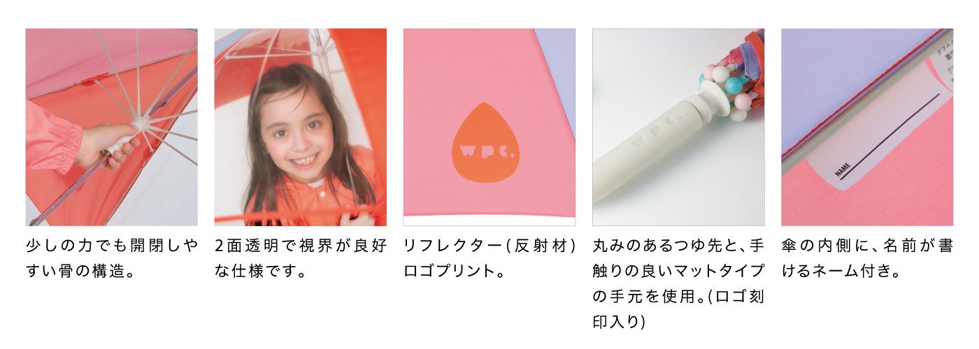 子供達にとって傘は雨の日にだけ使う”特別なアイテム”。Wpc.の子供用雨傘はお気に入りの1本を安全にお使いいただける工夫が詰まっています。