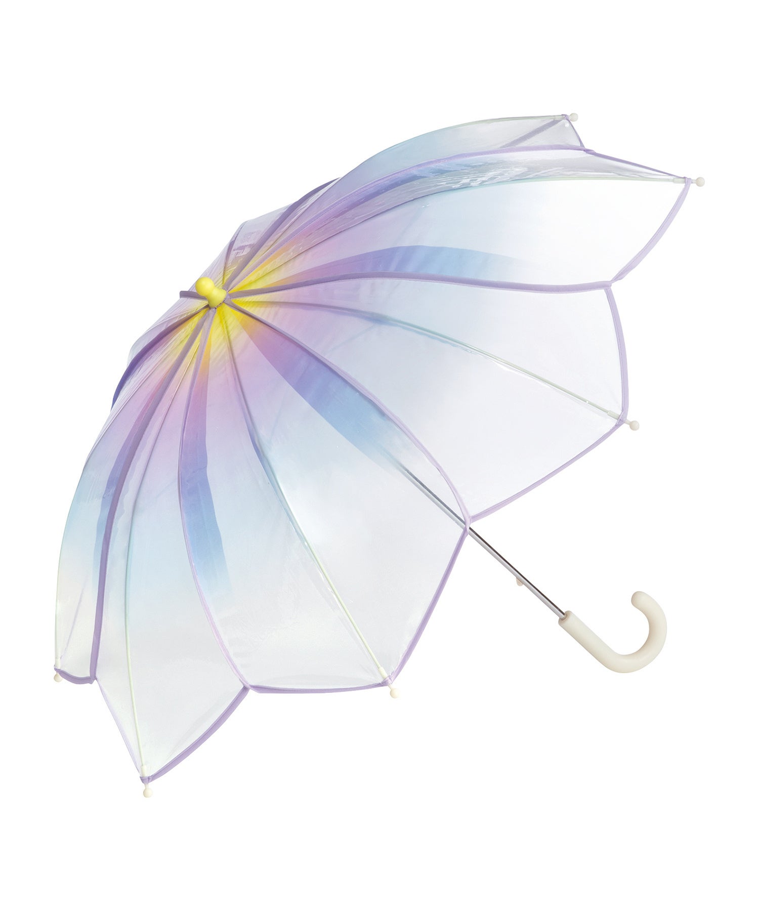 傘全体に広がるグラデーションが特徴。少し大人っぽいデザインに仕上げているので、小学校中学年のお子様でもお使いいただける親骨55cmの大きめサイズで展開します。同じデザインの大人用ビニール傘もご用意しているので、親子でお揃いもOK!