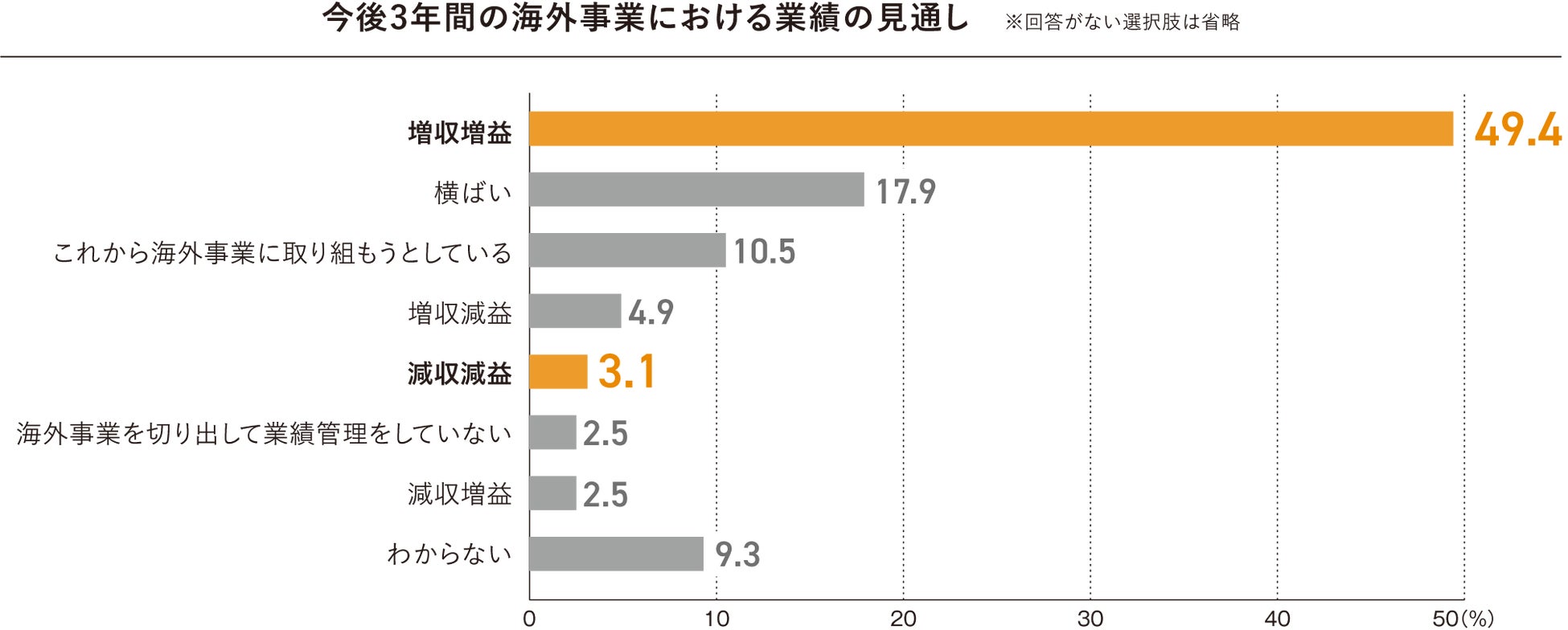 2023年12月に発表された日銀短観(「1.業況判断(続)」「(参考)業況判断の選択肢別社数構成比」)では、日本企業全体の約70%が先行きを「さほど良くない」と回答しています。一方、本アンケートでは、約半数の企業が今後3年間の海外事業を好調と捉えており、「減収減益」と回答した企業は3.1%に留まる結果となっています。海外事業は日本企業における更なる成長を加速させるためのトリガーであると言えるでしょう。
