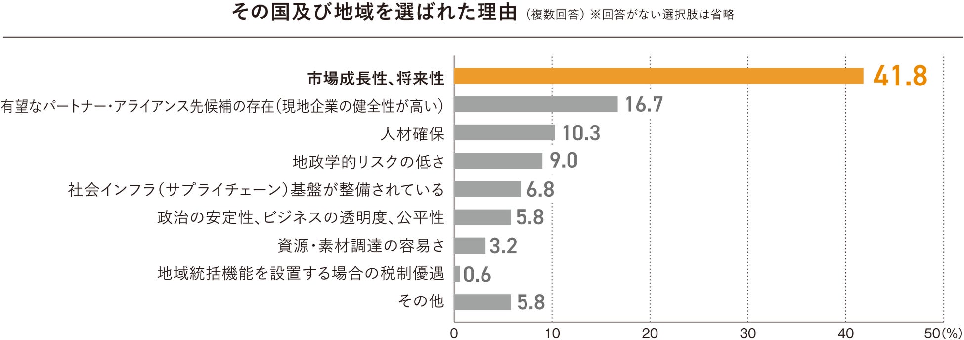 海外事業の進出・拡大を検討、もしくは進めている国及び地域の選定理由について、「市場成長性・将来性」が41.8%と最多となりました。有望なマーケットであるかどうかが、選定基準の一つとなっていることがうかがえます。