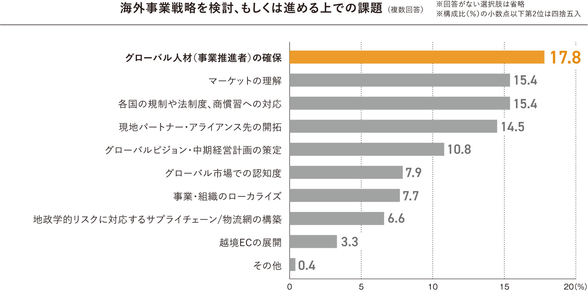 海外事業戦略を検討、もしくは進める上での課題について、「グローバル人材(事業推進者)の確保」が17.8%と最多となりました。事業を推進できるグローバル人材の確保・育成が課題となっていることがうかがえます。